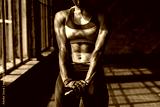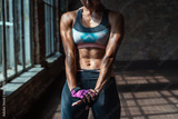 closeup young sporty fit woman in grey fitness pants bra workout gloves palm protector muscular body flat belly six-pack spacious modern gym bodybuilding sports healthy lifestyle concept copy space.