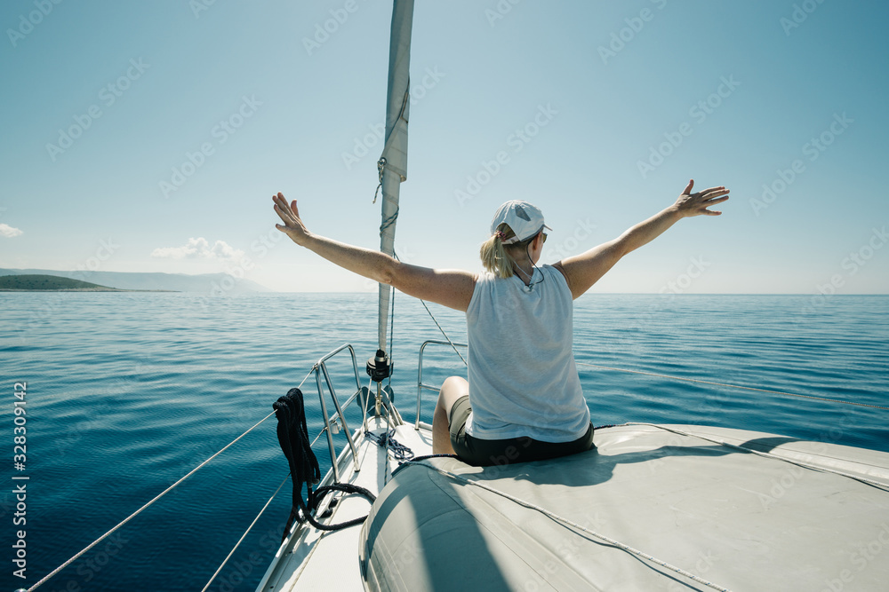 Woman sitting on the ships bow enjoying the yacht trip with arms wide open. Sailing, yachting and travel concept.