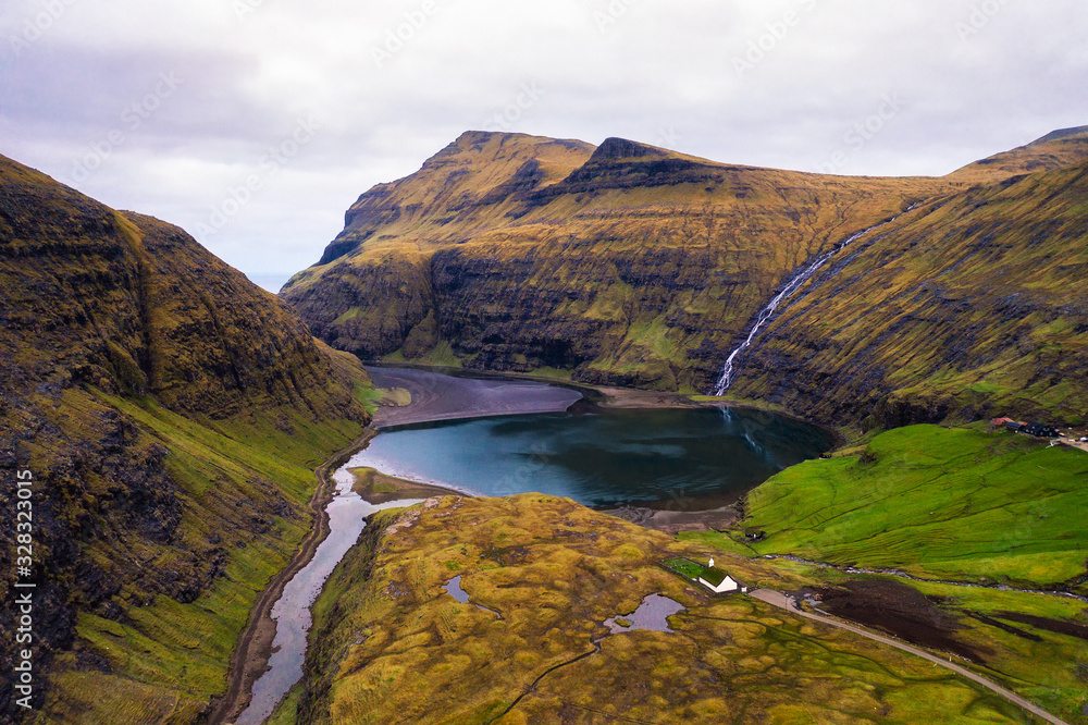 Aerial view of the lake near Saksun on the Faroe islands