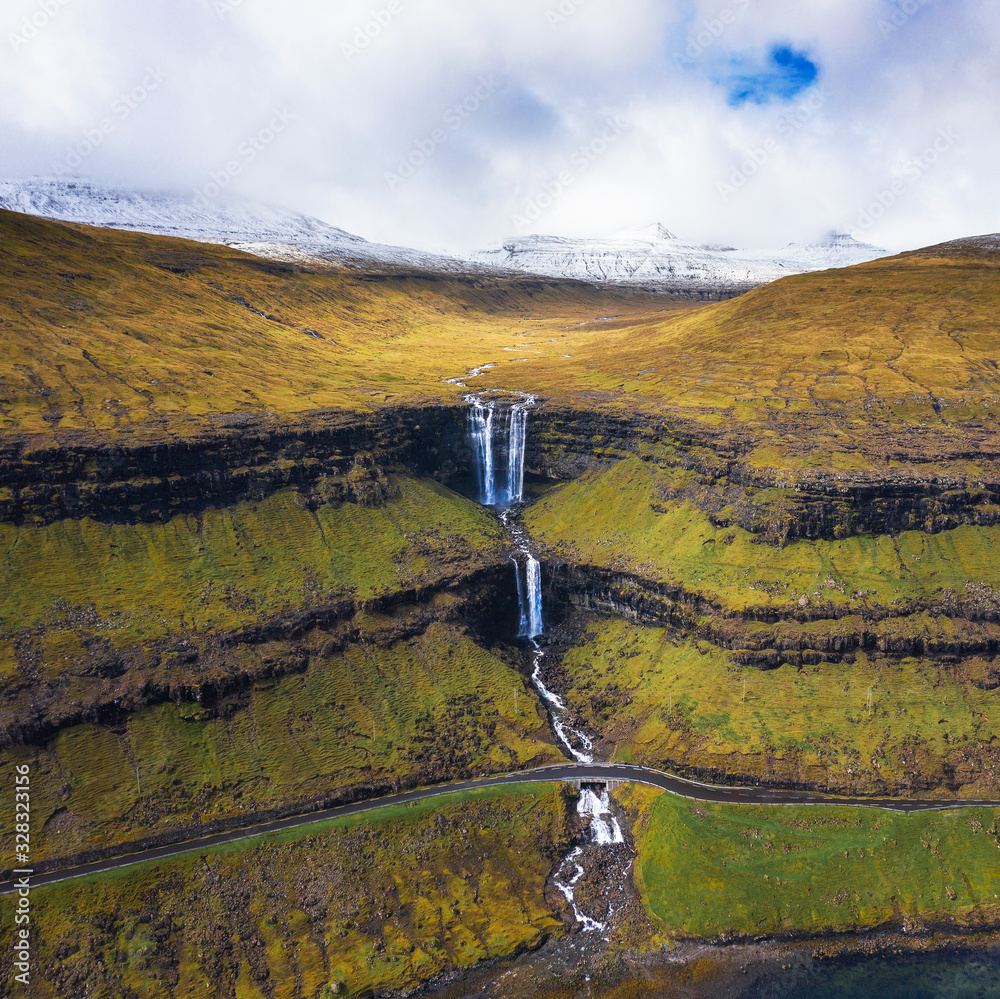 Aerial view of the Fossa Waterfall on island Bordoy in the Faroe Islands