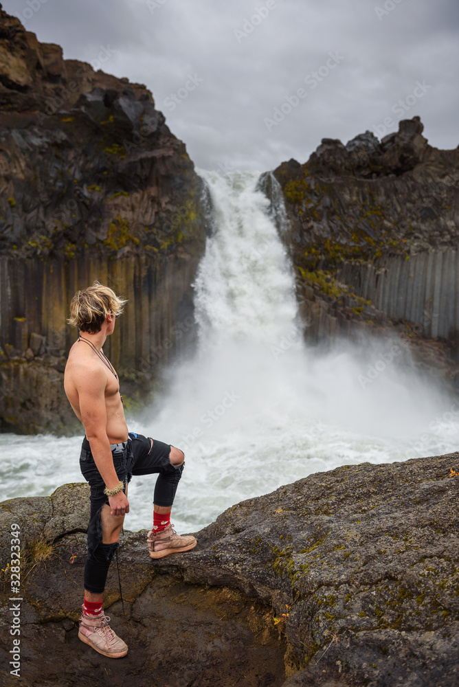 Shirtless and muscular boy looks at the Aldeyjarfoss waterfall in Iceland
