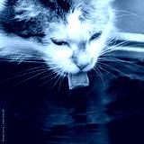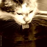 square portrait with a cute fluffy cat drinking water from a bucket on the street in the garden lapping pink tongue