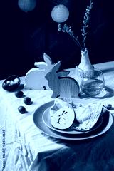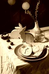 Easter table setting with wooden rabbit decoration, chocolate eggs and sweets, glasses of pink cocktail drinks, empty plates on white tablecloth. Lighting garlands. Holiday dinner.