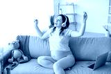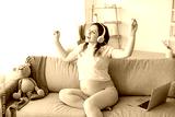 Beautiful pregnant woman listening to music at home