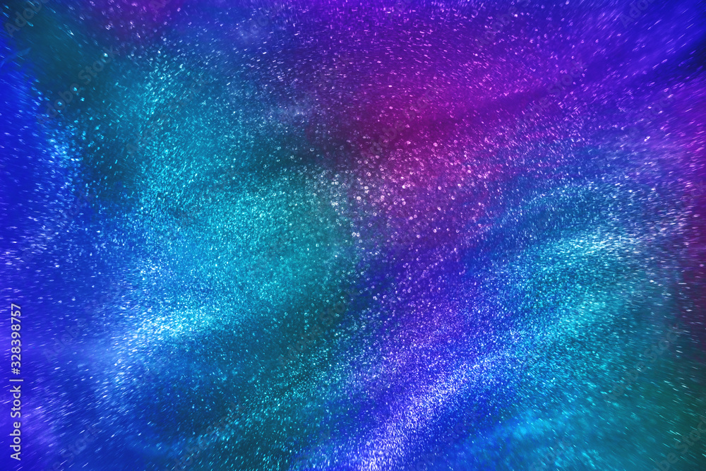 Abstract neon rainbow colored glitter particles flow with shallow depth of field underwater dust. Holiday disco magic shimmering under water festive party background. de-focused.