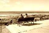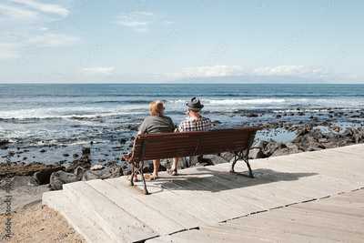 Elderly couple of tourists at a sea resort on a sunny summer day. Tourism and travel, vacation. Tropical island Tenerife landscape.