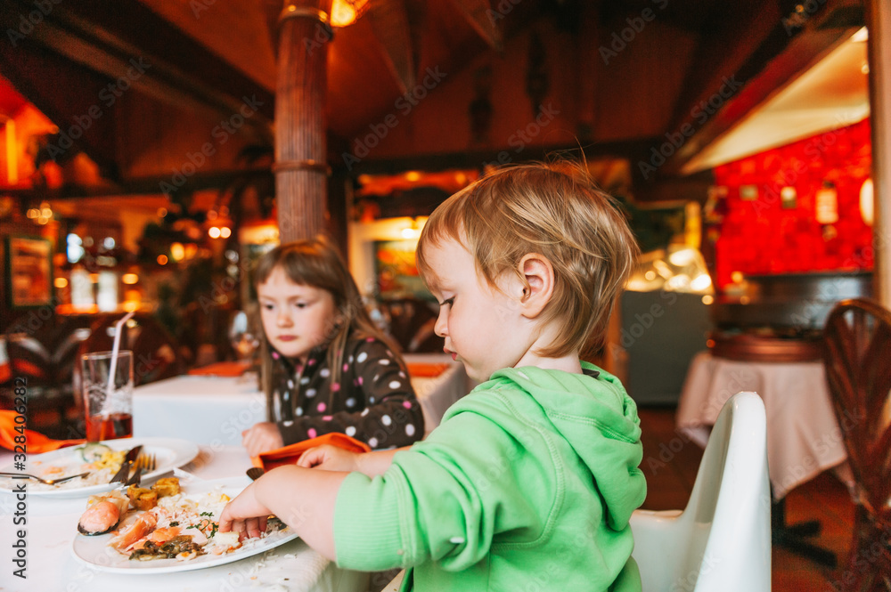 Two messy kids eating lunch in restaurant, toddler eating food with hands