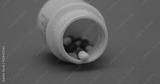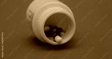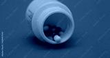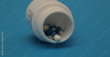 Capsule tablet close up on open plastic pharmaceutical bottle edge, inside other pills, isolated on blue