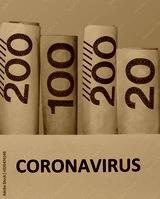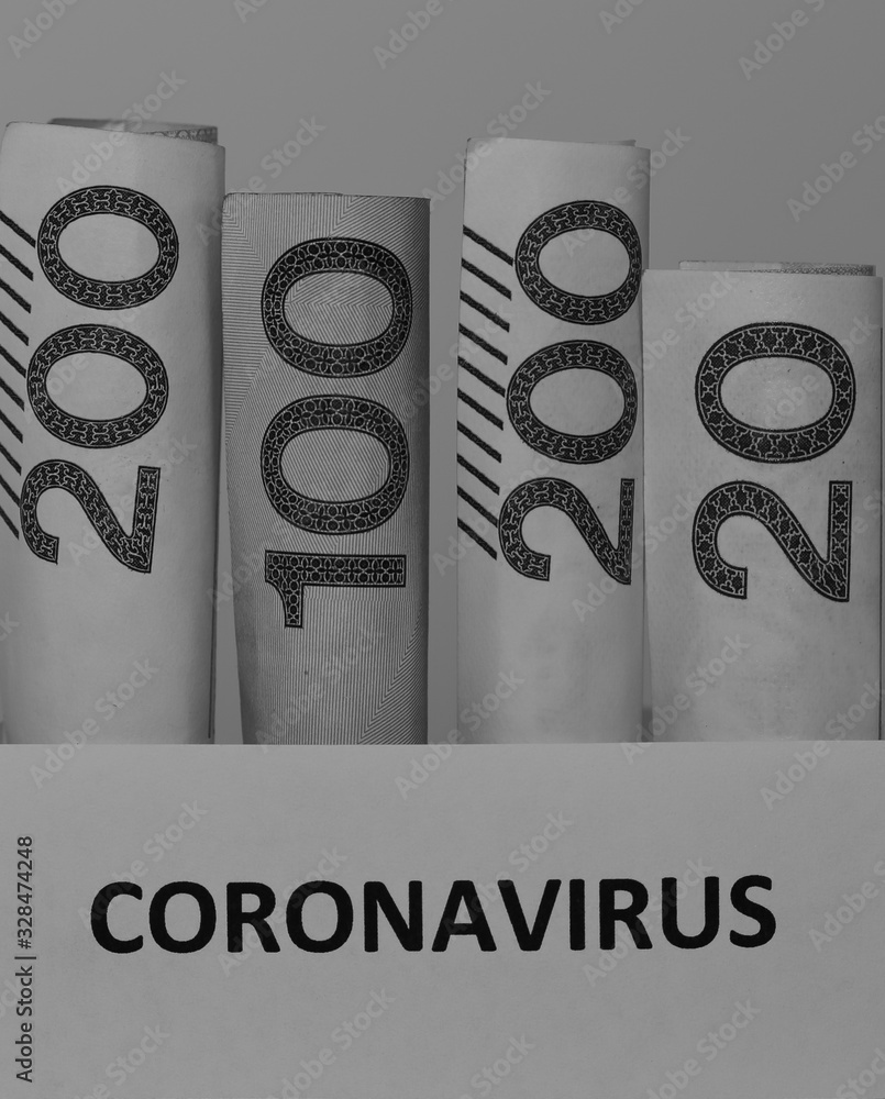 Banknotes of 200, 100 and 20 value rolled in rolls stand next to each other with word CORONAVIRUS in front, close up, monochrome black and white