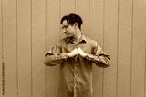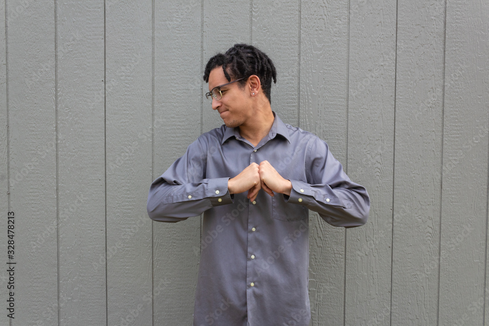 Profile view of mixed race man in glasses, hands chest height knuckles together and elbows extended out, natural black hair in short dreadlocks, horizontal aspect