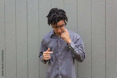 Young mixed race man looking down rubbing eye, furrowed brow, glasses, natural hair in dreadlocks, horizontal aspect
