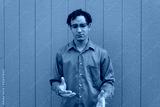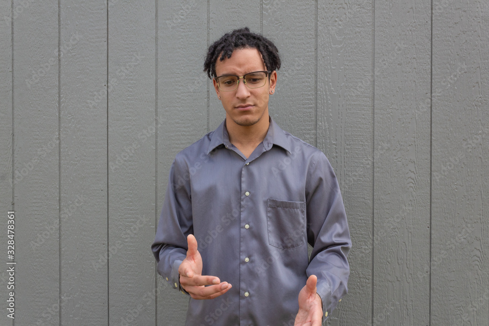 Young man looking down conflicted, bi-racial millennial male, natural black hair in short dreads, horizontal aspect