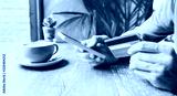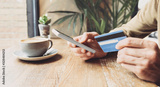 Man holding credit card and using smart phone in a cafe, travel, online shopping, ecommerce, internet banking, finance and freelance concept