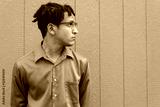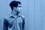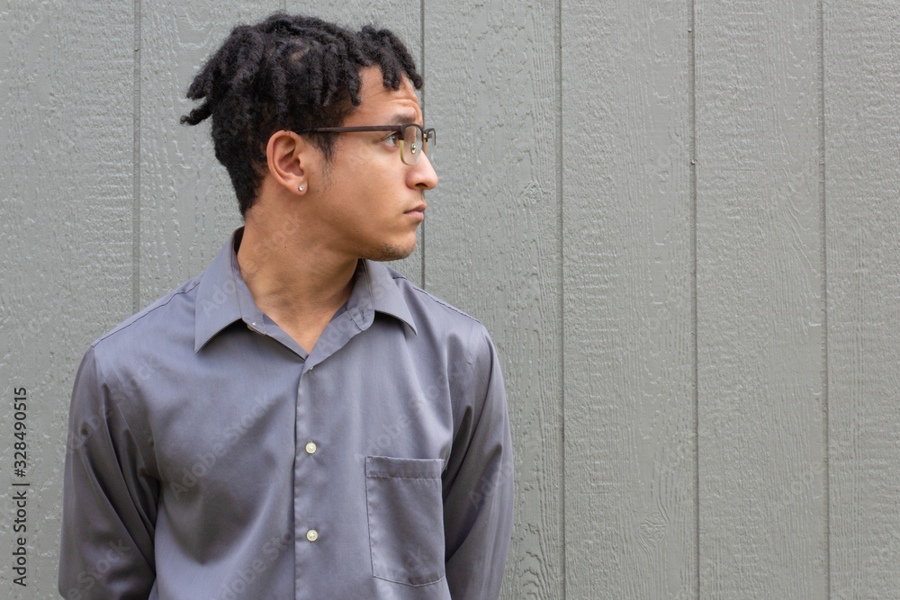 Mixed race millennial man, profile view in glasses looking up, neutral background copy space with light texture, horizontal aspect