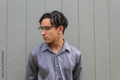 Multiracial young man in eyeglasses, profile view with natural hair in dreadlock twists, serious demeanor, horizontal aspect