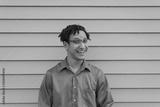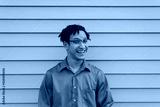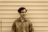 Young bi-racial male, quarter turn with open smile, happy man with natural hairstyle dreadlocks, horizontal aspect
