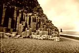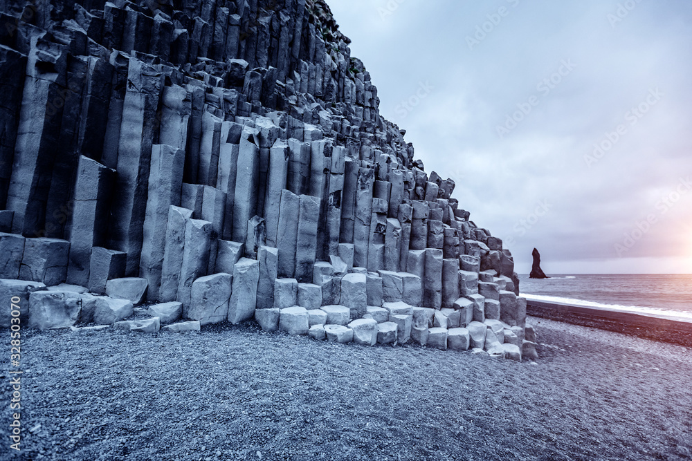 A unique rock on the Atlantic Ocean. Location Reynisfjara Beach, Iceland, Europe.
