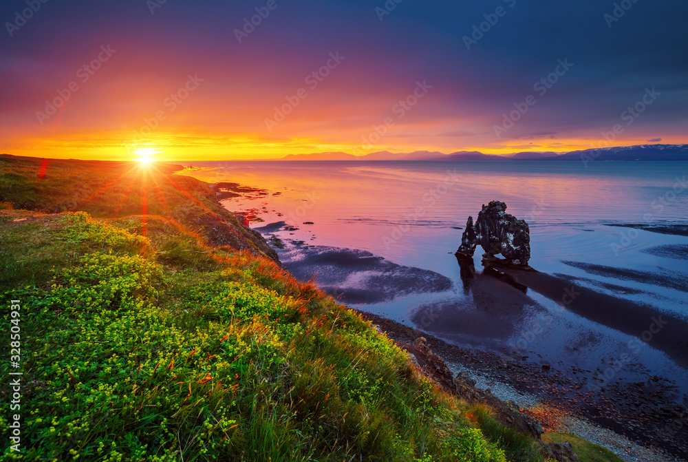 Charming view of the Atlantic ocean at dawn. Location place famous Hvitserkur rock, Vatnsnes peninsula, Iceland, Europe.