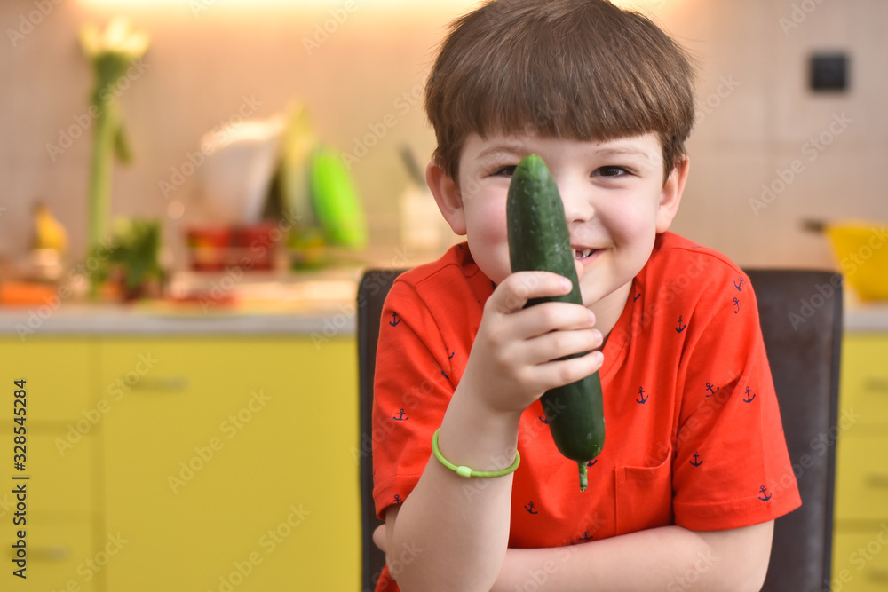 Happy boy eat a fresh cucumber. Cheerful child eating cucumber