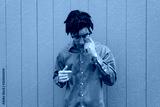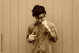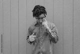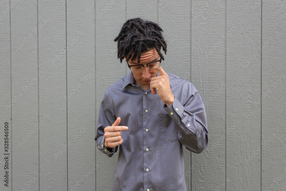 Mixed race young millennial man scratching eye with finger, eyes closed looking down, itch, horizontal aspect