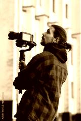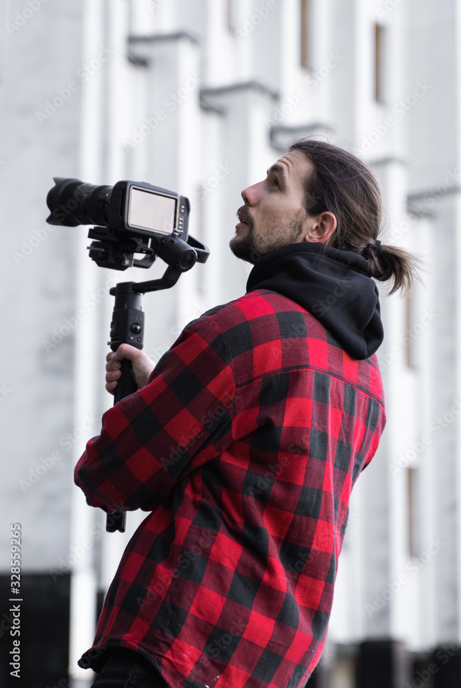 Young Professional videographer holding professional camera on 3-axis gimbal stabilizer. Pro equipment helps to make high quality video without shaking. Cameraman wearing red shirt making a videos.