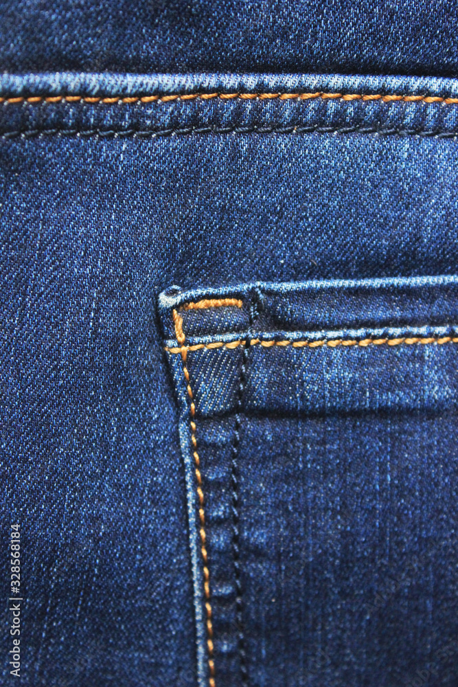 Jeans fabric backside pocket detailed close up view. Pocket seams and stitches pattern on casual dark blue denim jeans, vertical classic trousers fragment top view