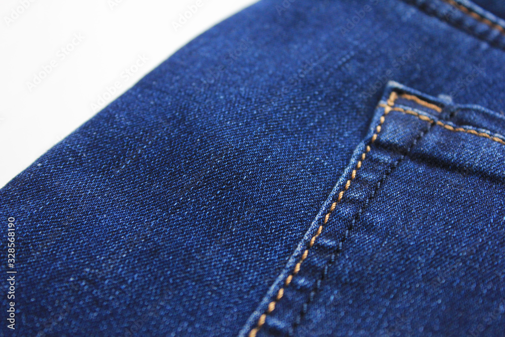 Denim blue jean fabric texture, back pocket seams close up. Casual jeans material isolated on white background, classic pants detail