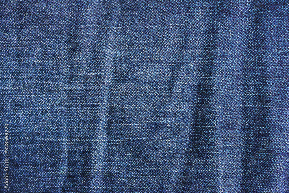 Wrinkled denim jeans cloth, creasy dark blue jean fabric. Worn crumpled jean material, classic clothing detail, creasy jeans close up view
