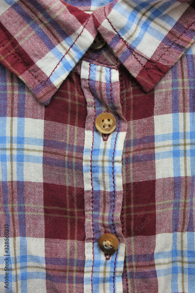 Flannel squared shirt pattern close up top vertical view. Casual t-shirt, plaid fabric purple texture with tartan background. Colored button-up shirt with collar neck
