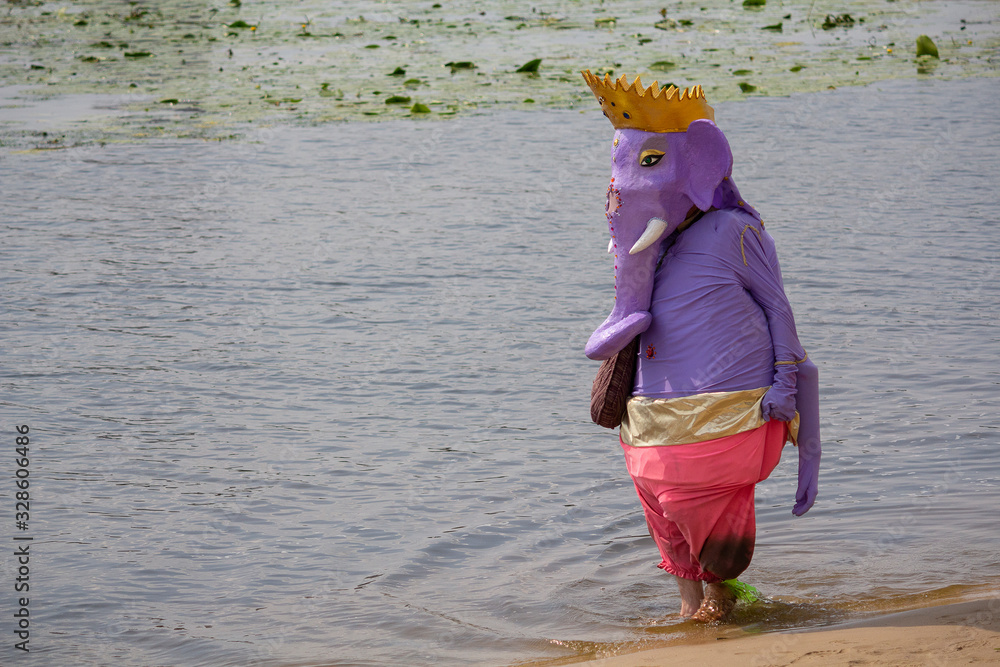 Man in a suit Hindu god Ganesh is on the bank of the river. Festival of Vedic culture Vedalife