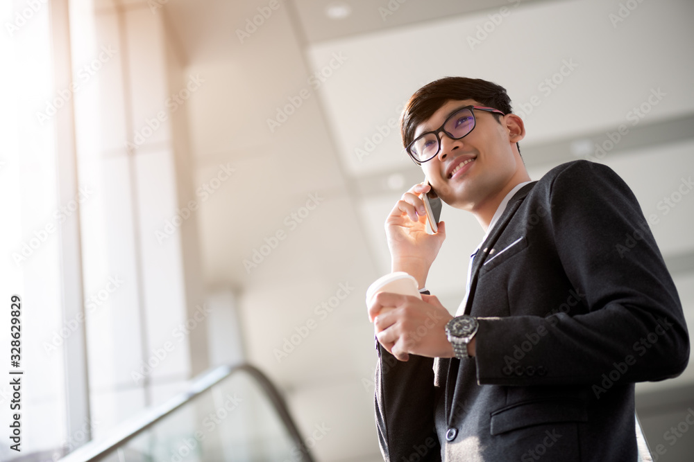 A asian handsome young businessman holding his hot coffee cup while using his phone and standing on the escalator. Business concept.