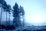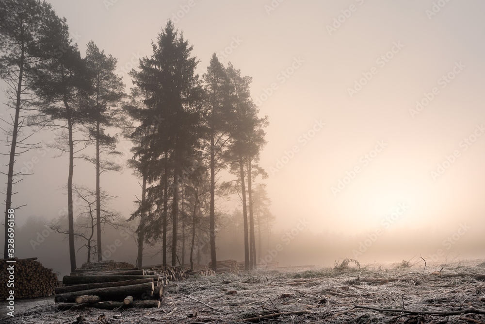 Sunrise over cut down trees. January landscape. Masuria, Poland.