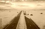 Aerial view of half desert road or street with sand dune in Dubai City, United Arab Emirates or UAE. Natural landscape background at sunset time. Famous tourist attraction. Top view.