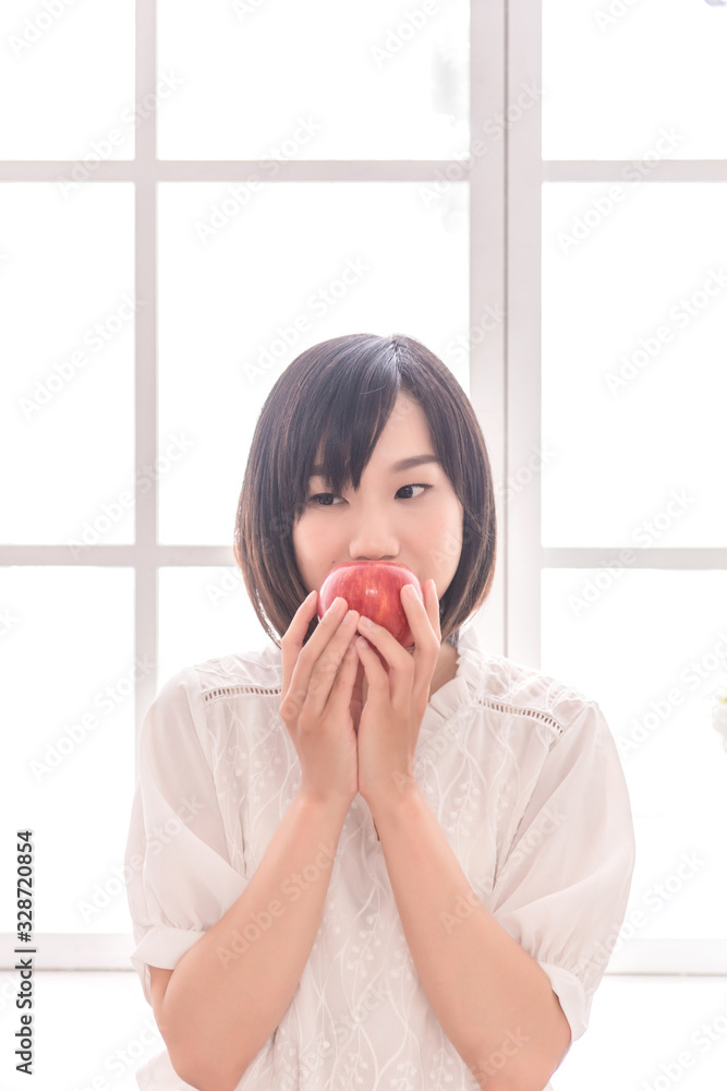 Beautiful Asian girl with apple in house, education or health or startup business concept, modern office or living room with copy space