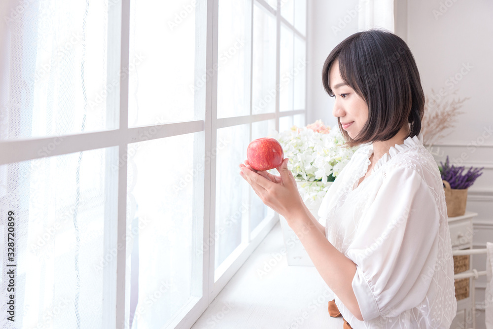 Beautiful Asian girl with apple in house, education or health or startup business concept, modern office or living room with copy space