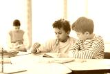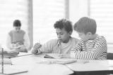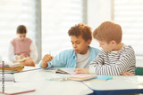 Horizontal portrait of two middle school male students sitting at desk in modrn classroom completing task together, copy space