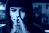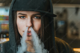 Young pretty woman in cap smoke an electronic cigarette at the vape shop. Hip-hop style. Closeup.