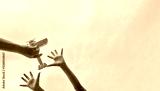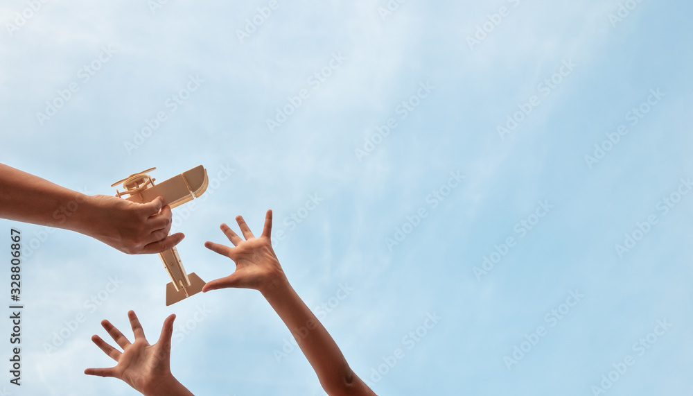 Children hands and father hands playing wooden plane toy on a beautiful sky background, Low angle view.