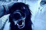 Close-up of male hand petting stray dog in pet shelter. People, Animals, Volunteering And Helping Concept.