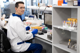 Smiling young scientist sitting at the table with test tubes