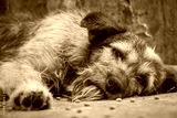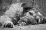 Lonely stray dog lying on the floor in shelter, suffering hungry miserable life, homelessness. Shelter for animals concept