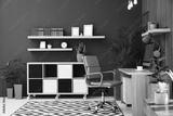 Comfortable workplace with computer near wooden wall in stylish room interior. Home office design