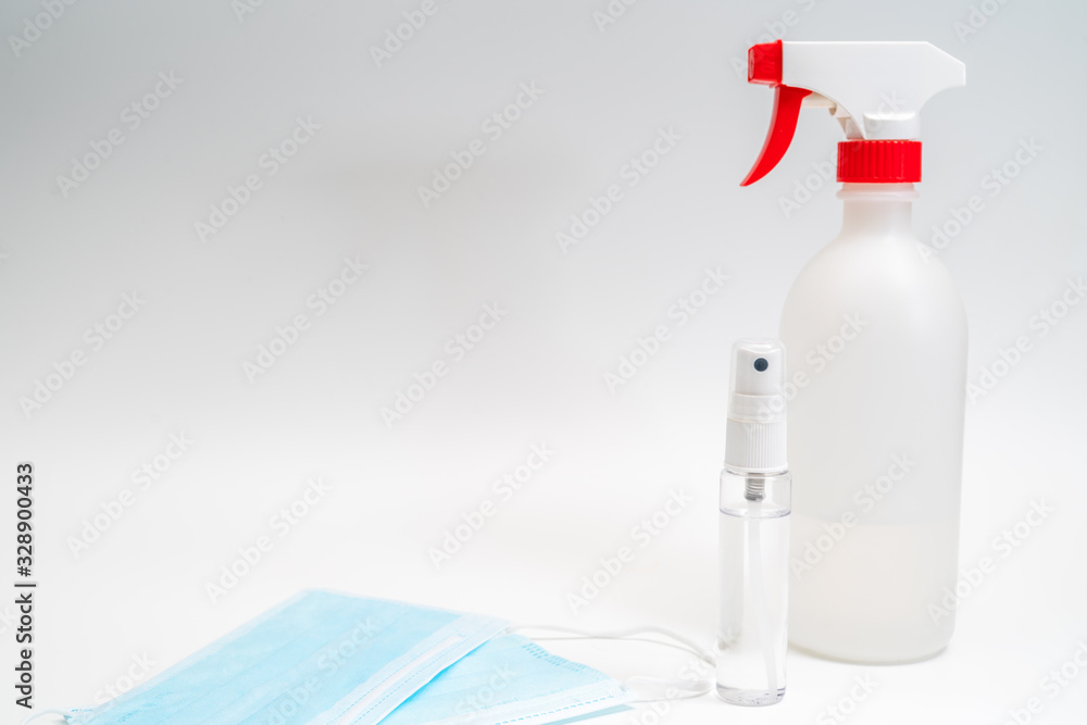 Protective face mask and sanitizer gel dispenser on white background, against Novel coronavirus (2019-nCoV) or Wuhan coronavirus and Influenza. Antiseptic, Hygiene and Healthcare concept