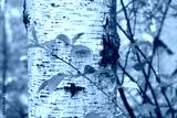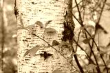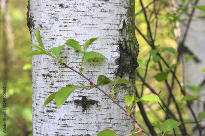Young birch with black and white birch bark in spring in birch grove against the background of other birches