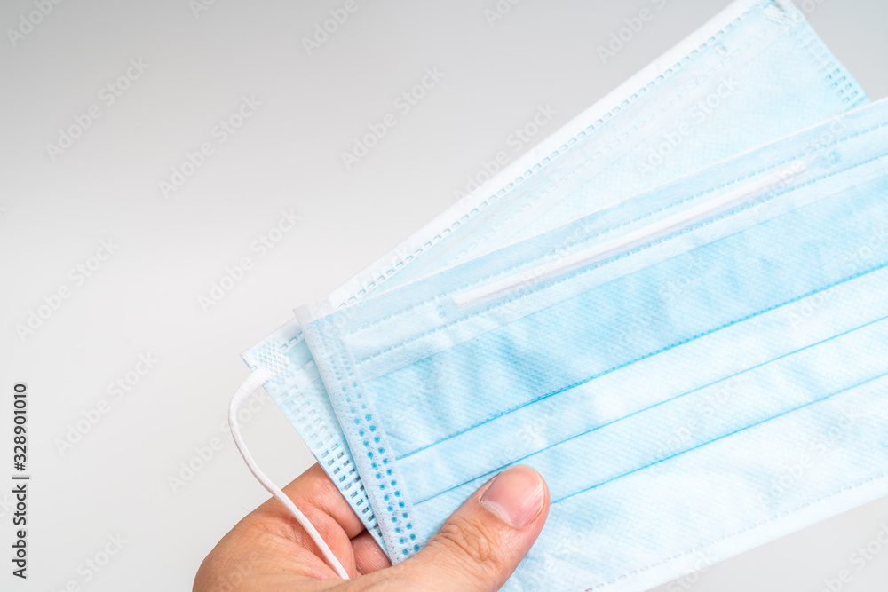 Protective face mask and sanitizer gel dispenser on white background, against Novel coronavirus (2019-nCoV) or Wuhan coronavirus and Influenza. Antiseptic, Hygiene and Healthcare concept
