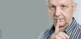 Man keeping a secret or asking for silence. Copy space. Confident mature man in shirt holding finger on lips and looking at camera against grey background.