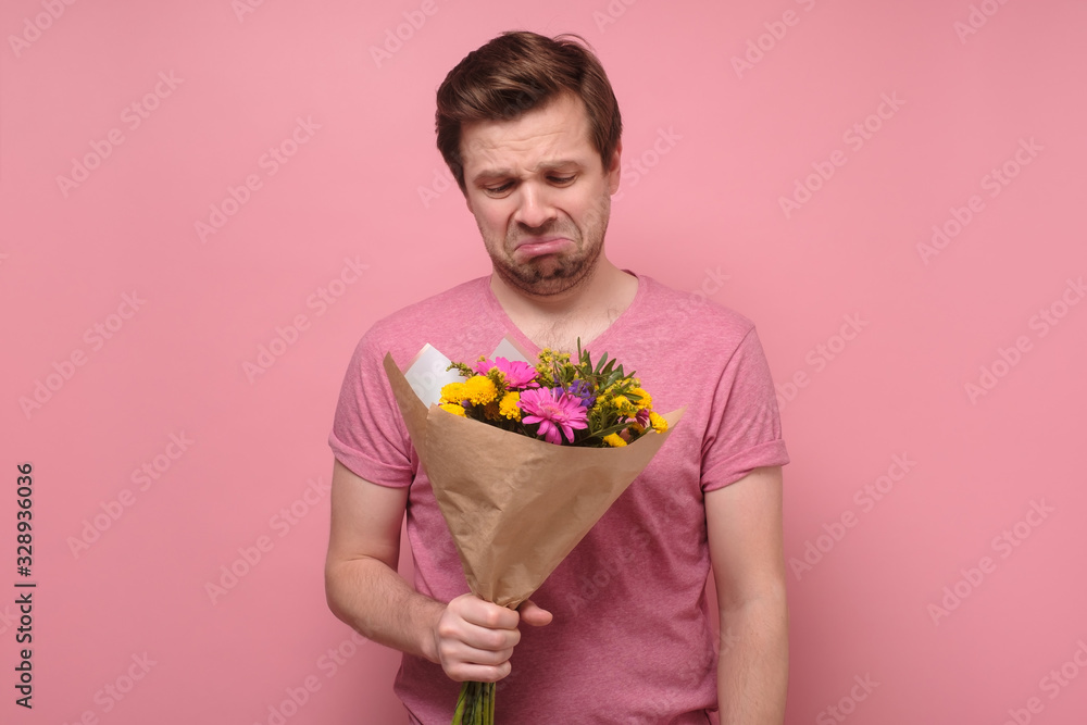 Sad lover or broken hearted man in pink clothes standing with flower bouquet.a