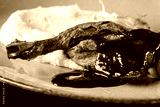 Italian food. Fried quail with sweet potato puree with berry sauce. Serving dishes in a restaurant in a blue plate. background image, copy space text