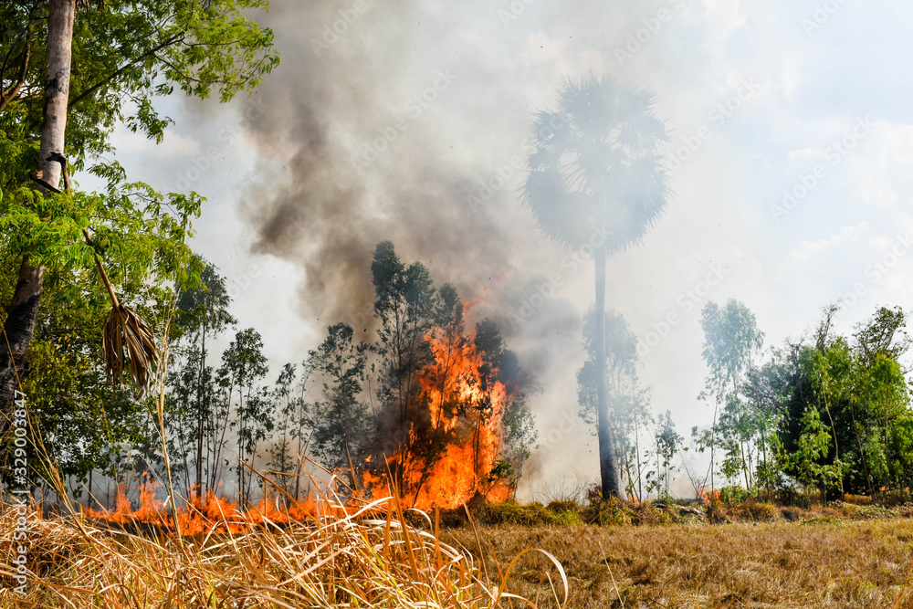 Fire burns stubble on the field. Fire in summer.