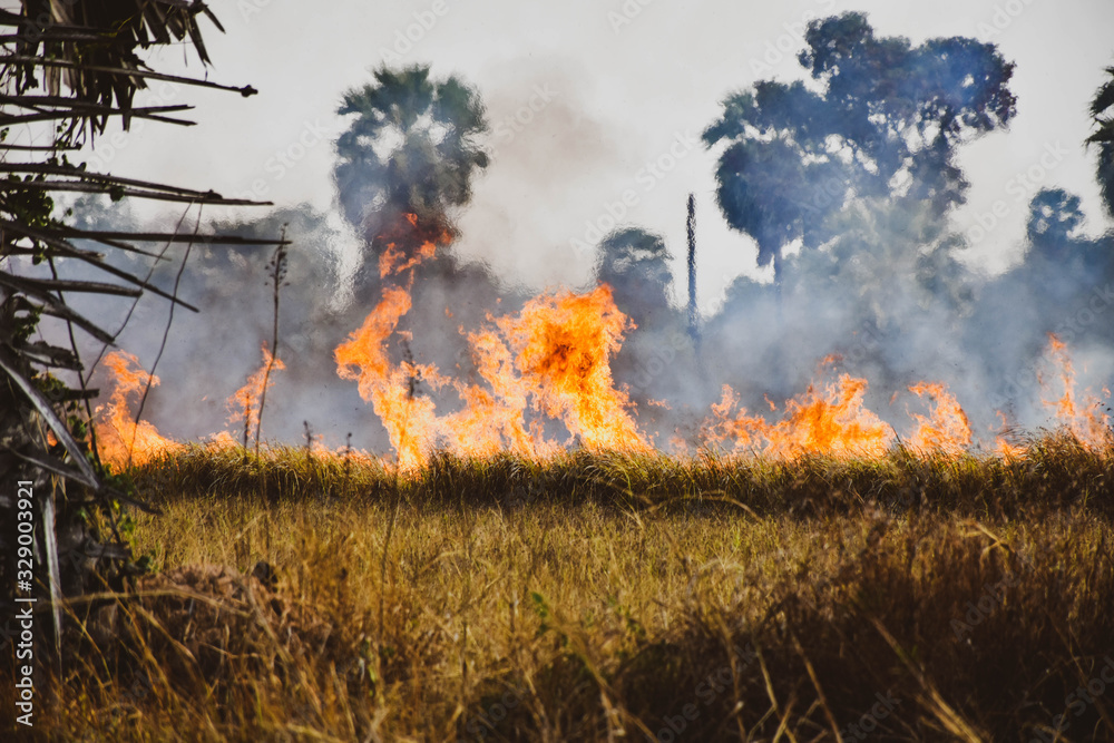 Fire burns stubble on the field. Fire in summer.